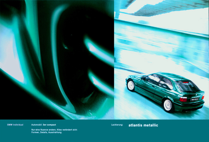 Mein größtes Projekt bei BMW. Gedruckt in 12 Farben. Ein Traum für jeden Art Direktor. Mein Konzept bestand darin, den interessierten Kunden an die Hand zu nehmen, Ihm zu zeigen, was gutes Design beinhaltet. In der zweiten Auflage wurde ich von BMW aufgefordert, mit am Design der Fahrzeuge zu arbeiten. Jedes Fahrzeug auf der Strasse, ist Werbung für BMW. Die Herausforderung bestand darin, Lackierungen, Interieur, auch im Druck umzusetzen. Farbflächen wurden in Pantone-Farben gedruckt. Farbfächer in Original-Lackierungen.