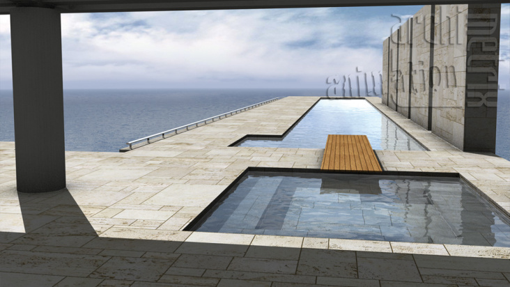 mitte der neunziger, während des studiums in mailand, befassten wir uns mit den briefen von plinius dem jüngeren, in welchen er sein laurentinisches landgut aus dem 1. jahrhundert n. chr. beschrieben hat. ausgehend von dieser beschreibung entwarfen wir zwei bereiche der villa in einer modernen architektursprache: den wohnturm und die thermen. trotz zeitgemäßer gestaltung legten wir dabei wert auf die typisch römischen baumerkmale wie meterdicke aussenwände, um die hitze abzuhalten und nischen darin unterzubringen, großzügige räume sowie die einbindung der landschaft in die architektur. als wir uns im sommer vor sechs jahren ein wenig langweilten, übertrugen wir unseren entwurf in ein 3d-modell und führten einige atmosphärische studien durch.