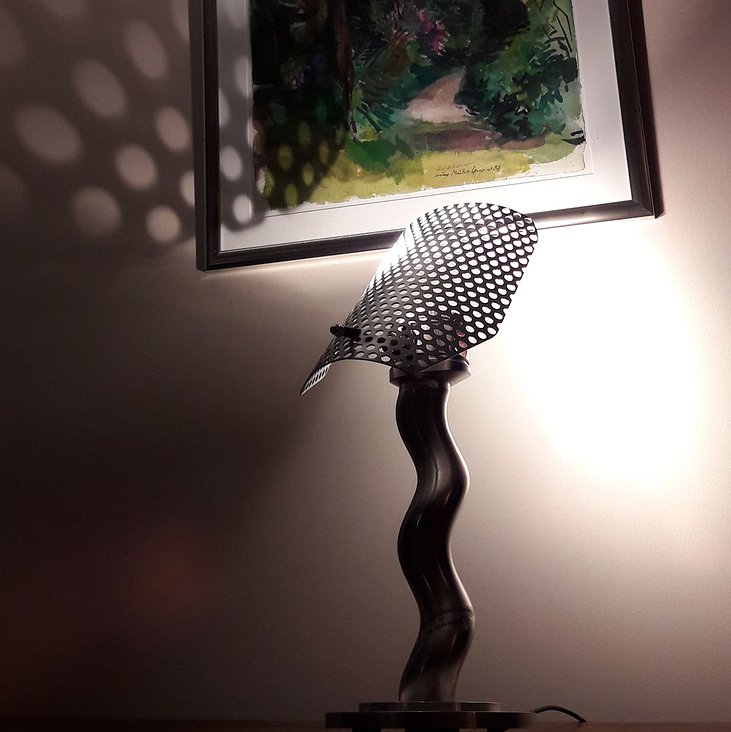 Diese Designerlampe ist aus einem runden Aluminiumsockel und einem gedrehten Edelstahlrohr zusammengesetzt. Ursprünglich wurde das Rohr als Rührstab einer Teig-Knetmaschine eingesetzt. Abgeschirmt wird der Schein des Halogenreflektors durch ein perforiertes Aluminiumblech, das wo immer die Lichtstrahlen auftreffen, ein imposantes Schattenspiel erzeugt.
