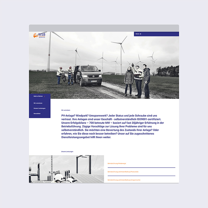 Die Betriebsführung von Windenergie- und Photovoltaikanlagen ist ihr Business – und zwar seit 1999. Mit 313 Windenergie- und Photovoltaikanlagen ist die WSB Service Deutschland GmbH einer der erfolgreichsten unabhängigen Betriebsführer in Deutschland. Die WSB Service Deutschland GmbH beauftragte Sonderform, ein neues aussagekräftiges Web Design zu erstellen.