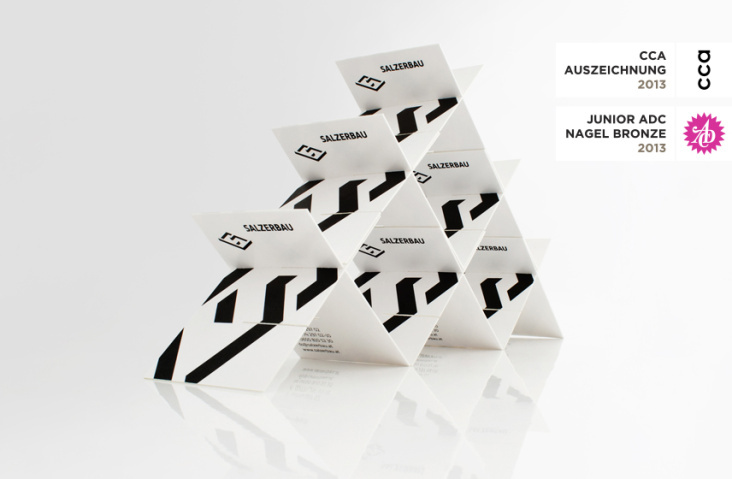 Die Visitenkarten haben zwei gestanzte Schlitze, die den Buchstaben S für Salzerbau ergeben. Dadurch werden die Visitenkarten zu kombinierbaren Bausteinen.