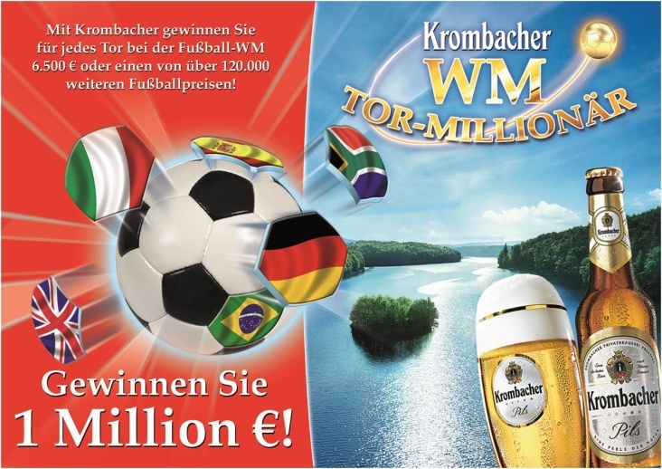 Am 22. Dezember 2008, in einer ansonsten menschen- und kollegenleeren Agentur (mein ehemaliger Arbeitgeber at sales, Essen) ersannen Herr Wenning, Herr Blau und ich die tollkühne Idee des „Krombacher Tor-Millionärs“, bei dem die Krombacher Kunden die mit Trikotnummern bedruckten Flaschenrückenetiketten sammeln, und so unter anderem die Chance auf den Gewinn von 1 Million Euro erhalten sollten. Im festen Glauben, mit dieser Idee nicht durchzukommen, entwickelten wir eine mitreißende Präsentation, voller Emotionen. Und zu unserem großen Erstaunen, setzte sich diese Idee durch, wurde als erfolgreichste Krombacher Promotion überhaupt 2009 in Zusammenarbeit mit der DFL umgesetzt und fand sogar noch ein Spin-Off im 2010er „Krombacher Tor-Millionär 2“ zur Fußball-WM 2010. Umgesetzt für und mit at.