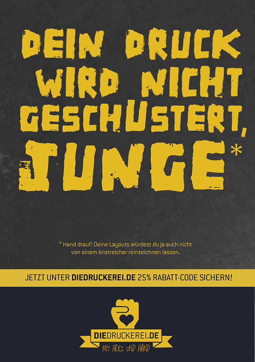 Die Lösung: diedruckerei.de ist eine „echte“ Druckerei. Das bedeutet: Hier nehmen Menschen Druckaufträge entgegen, die ihr Handwerk verstehen und genauso lieben, wie der Grafiker seinen Beruf. Menschen, die wissen, dass ein Grafiker jeden Tag für das Schöne in der Welt kämpft und ihm deshalb mit Verständnis und Respekt begegnen. Wir brachten dieses Qualitätsversprechen in einerKampagne zum Ausdruck, die die Verbundenheit mit der Zielgruppe dokumentiert.