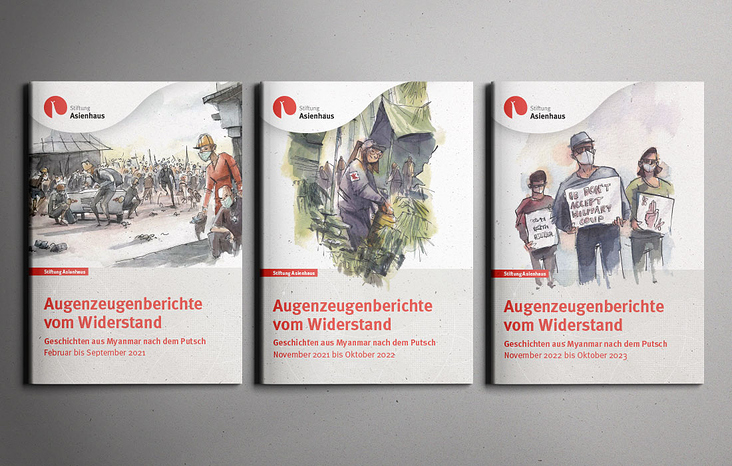 Das Layout folgt den Corporate-Design-Vorgaben der Stiftung Asienhaus und übersetzt diese präzise in ein eigenständiges Publikationsformat. Die hochwertigen, ausdrucksstarken Zeichnungen sind dynamisch und luftig in das typografische System integriert. Weißräume, klare Hierarchien und gezielte Spannungspunkte schaffen Orientierung, Struktur und visuelle Dramaturgie, ohne die Aussagen der Berichte zu überformen.