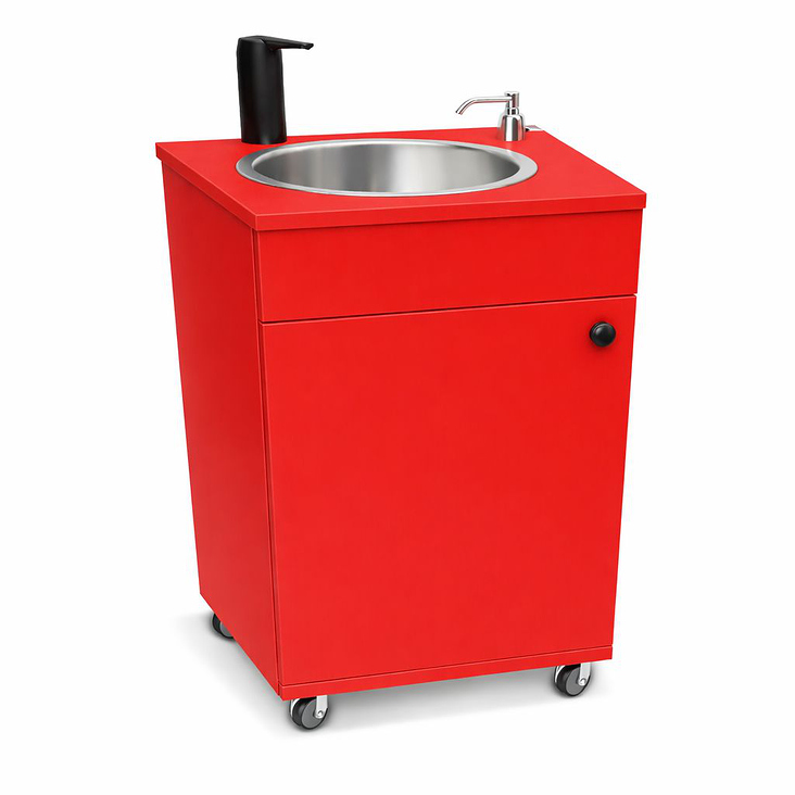 Ausgestattet ist das System mit einer hochwertigen Edelstahlspüle sowie einem integrierten 1-Liter-Seifenspender. Die Konstruktion ist auf Rollen aufgebaut und dadurch mobil einsetzbar sowie leicht zu transportieren.