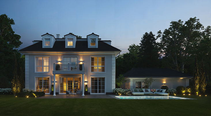 Licht spielt im gesamten Projekt eine zentrale Rolle. Es macht Strukturen sichtbar, betont Materialien und erzeugt Emotion – von weichem Tageslicht im Interior bis hin zu warmen Abendstimmungen, die der Villa eine beinahe filmische Präsenz verleihen.