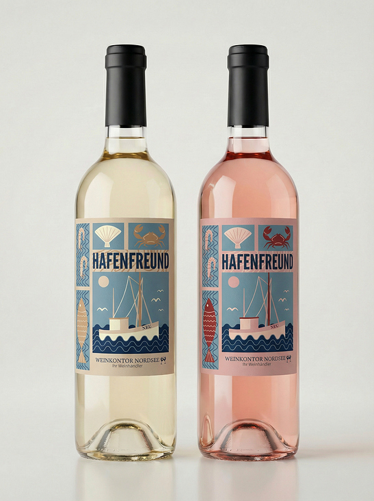 Für eine Charity-Weinaktion des Vereins Hafenfreunde Neuharlingersiel e.V. entwickelte ich eine Serie von Weinetiketten, die exklusiv über das Weinkontor Nordsee in Esens vertrieben werden. Ziel war es, ein visuell eigenständiges Design zu schaffen, das sowohl den maritimen Charakter der Nordseeküste als auch den lokalen Bezug des Projekts widerspiegelt.