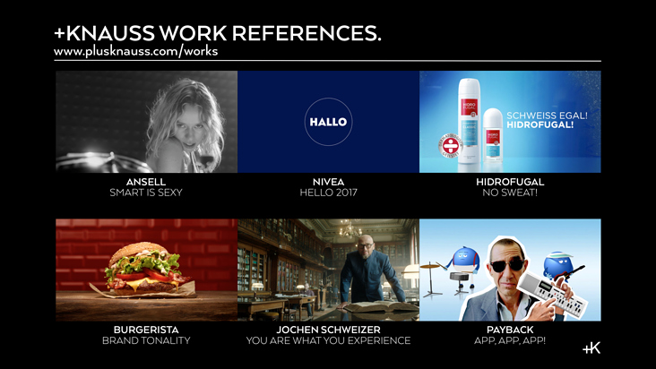 +KNAUSS is a privately-hold idea agency for communica on, design and new product development. Currently we are a team of 20 highly-decorated individuals, working in our offices in Hamburg and Munich. Our wide range of clients include well-known companies such as Payback, Nivea, Hidrofugal, Jochen Schweizer, Pixum etc.