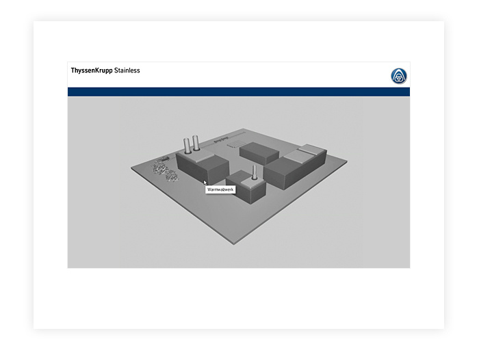 Layout des interaktiven Rundgangs durch die Produktionsstätten; Arbeit strikt nach CD-Vorgaben des Kunden; 3D-Animation von der Firma pixeleen