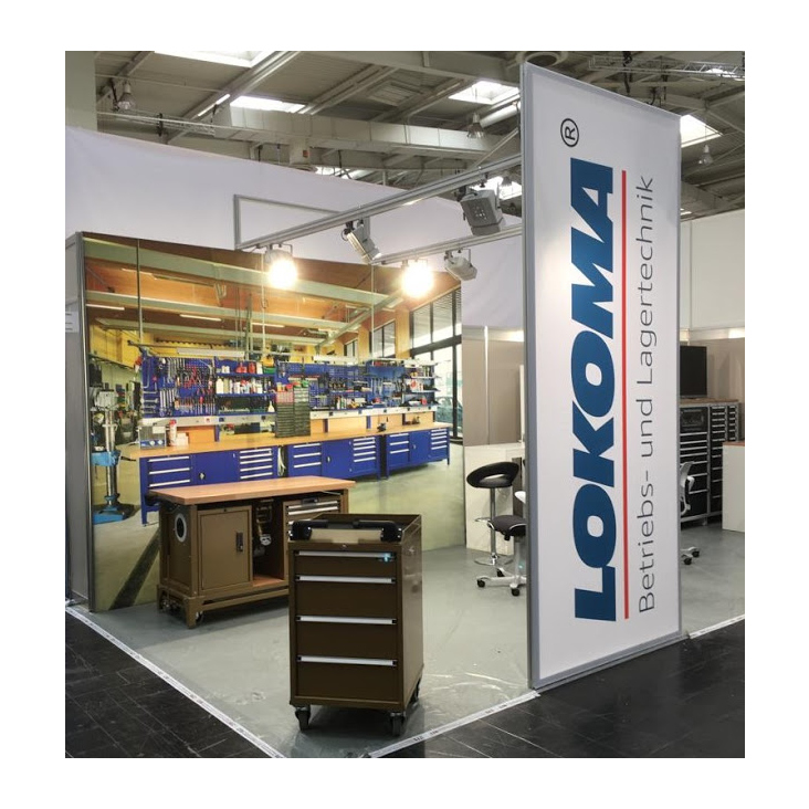 Messestand mit Großformat-Motiv auf Textil, Alu-Spannrahmen hinterleuchtet, EMO Messe Hannover im September 2019