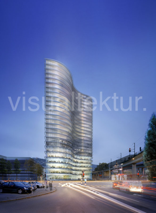 ingenhoven architekten aus düsseldorf setzen bei ihrem wettbewerbsbeitrag, für ein büro- und wohnhochhaus in zürich, auf die qualität der renderings von visualtektur. viel glück!